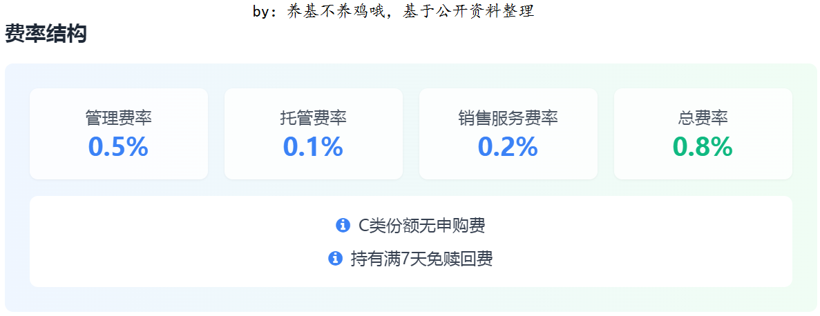 作为精打细算的上班族,基金费率我一直很看重。这只基金的管理费率0.5%、托管费率0.1%、销售服务费率0.2%,加起来才0.8%,在同类产品里算很低的了。而且C类份额没有申购费,持有满7天还免赎回费,平时想小额加仓、调整仓位都不用心疼手续费,特别适合定投或者分批加仓。
