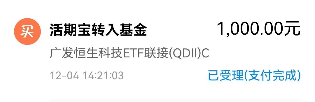1、$广发恒生科技ETF联接(QDII)C(OTCFUND|012805)$,买入1000元