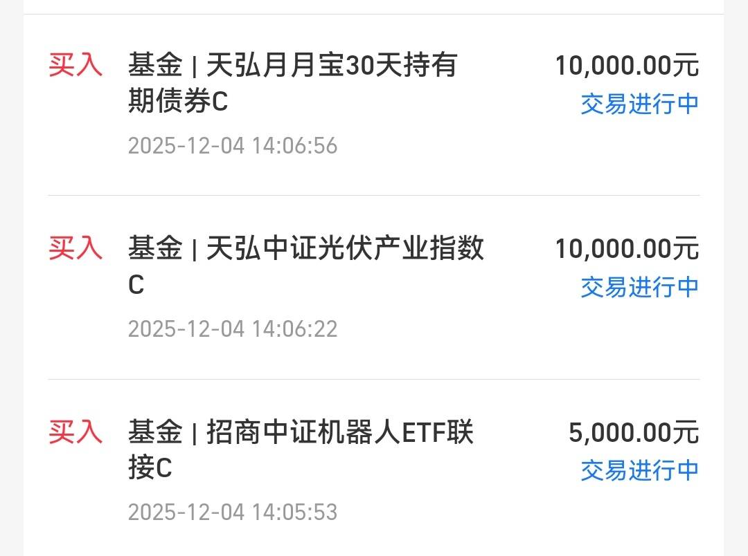 我今天加仓了恒生科技、机器人、光伏、天弘月月宝30天,减仓一只基金,其它基金继续持有待涨。