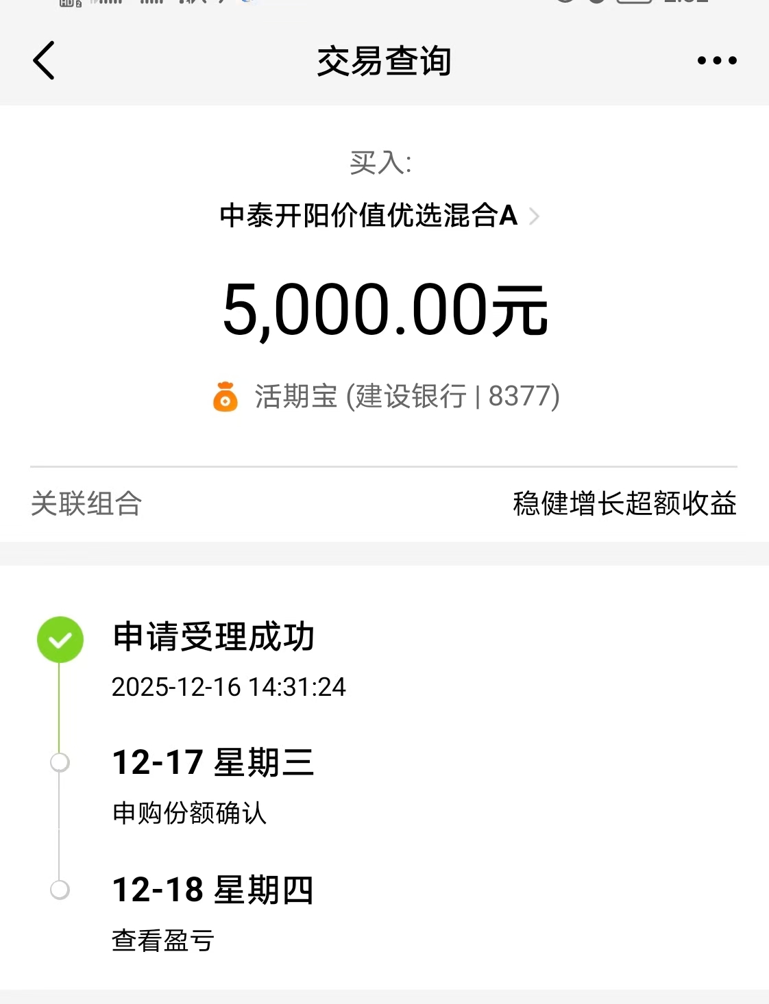 2.价值优选:我今天继续加仓$中泰开阳价值优选混合A(OTCFUND|007549)$5000元。本基金深入研究各大行业板块,牢牢把握供给侧改革政策带来的行业个股纠错机会,坚持质价双优布局,均衡布局多个行业如食品饮料如五粮液、泸州老窖,建筑材料方向如中国巨石。芯片半导体方向如兆易创新、思瑞浦和圣邦股份,基础化工方向如万华化学、华鲁恒升和华峰化学等。作本基金一年多时间,目前有20.75%的正收益,累计收益近3000元。它从不盲目追热点,风格稳定不漂移,严控回撤,净值不会大起大落,让投资者拿的心安,持有体验感很不错。比如今天这种极端下行行情,它前十大重仓股中居然仍有4支红盘,其中华峰化学涨近3%,确实非常厉害。这种产品市场中很稀缺,遇到就真得要非常珍惜。今天A股三大指数集体回撤明显,但尾盘有止跌反弹信号,金针探底信号明显。我认为这波调整基本到位,我看好A股接下来的行情。对本基金非常有信心,今天果断加仓低吸。下面我晒一下买入操作记录: