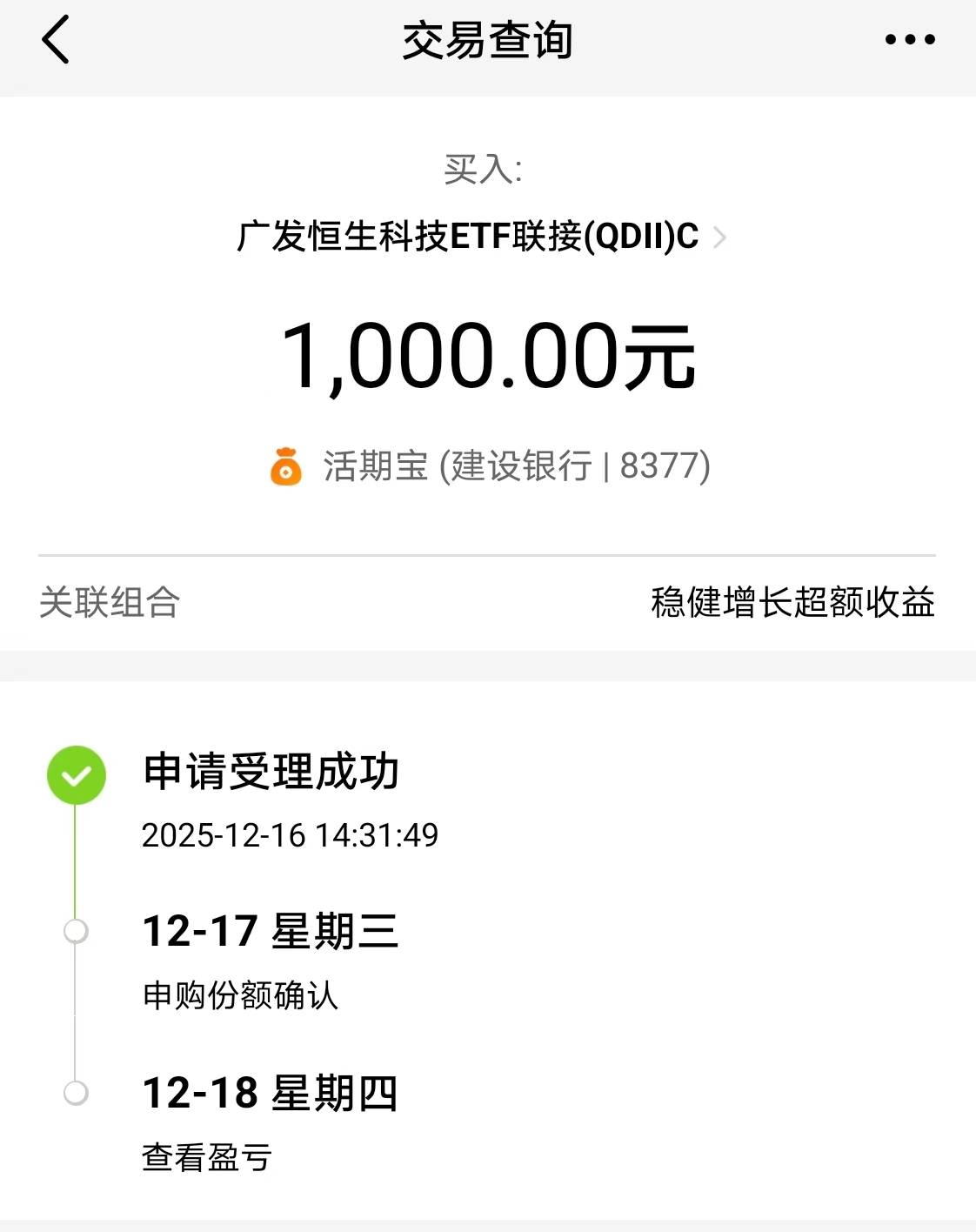 1.恒生科技:我今天继续加仓$广发恒生科技ETF联接(QDII)C(OTCFUND|012805)$1000元,这支基金是恒生科技指数的ETF联接基金。恒生科技指数包含众多的科技互联网以及芯片产业链公司,是中国资产中非常有代表性的科技指数,深受境内外科技投资者喜欢的指数。因为担心AI泡沫过大,美股科技持续回调。这种情绪进一步影响了港股和A股。港股已经连跌很多天了。这波情绪宣泄后,价值洼地出现,会来个黄金坑,给明年的上涨留下空间,不妨趁这个时候抓紧买入。展望未来,美12月继续降息25基点,明年也有至少一次降息。特朗普选定了新的美联储主席,按理会更听命于特朗普,而他是降息的坚定支持者。若明年有超预期的降息,那全球资本市场必将有所反应。往后人工智能AI算力持续催化,特别是应用端,预计多模态市场关注度以及后续业绩的提升空间都很大。我坚定看好恒生科技接下来的表现,今天继续加仓本基金。下面我晒一下买入操作记录: