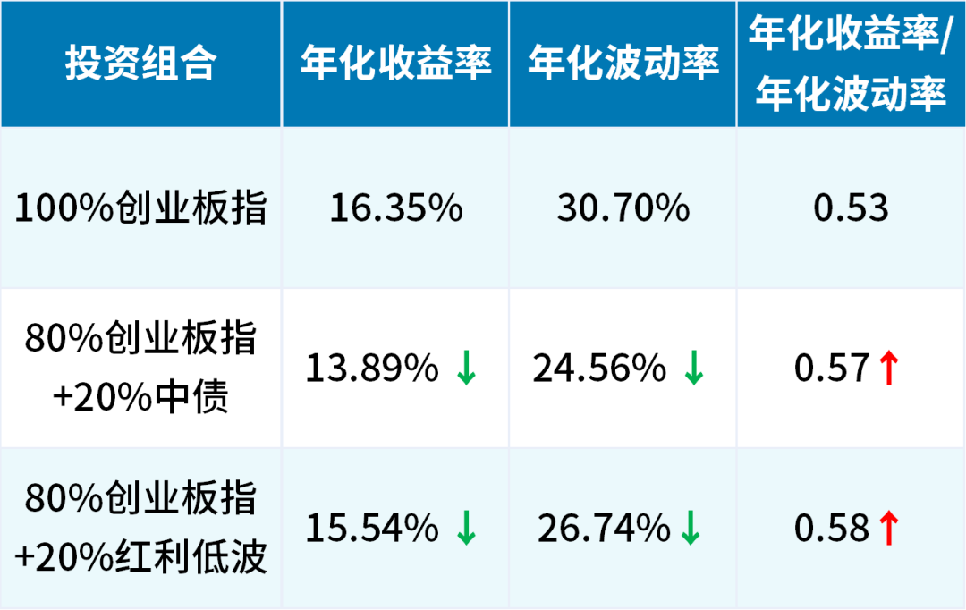长期来看,在单一投资创业板指数的情况下,加入一定比例的低波动资产,年化收益率虽然略有下降,但是年化波动率却降低不少,尤其是投资性价比(年化收益率/年化波动率)均有上升。