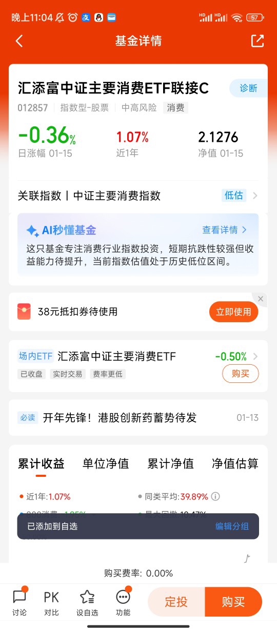 尊敬的过蓓蓓经理,您好!我是汇添富中证主要消费ETF联接C的持有人。想请教您:2
