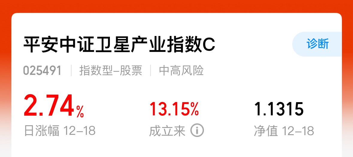 $平安中证卫星产业指数C$今天上涨了2.74%,近-个月上涨17.77%,YYDS