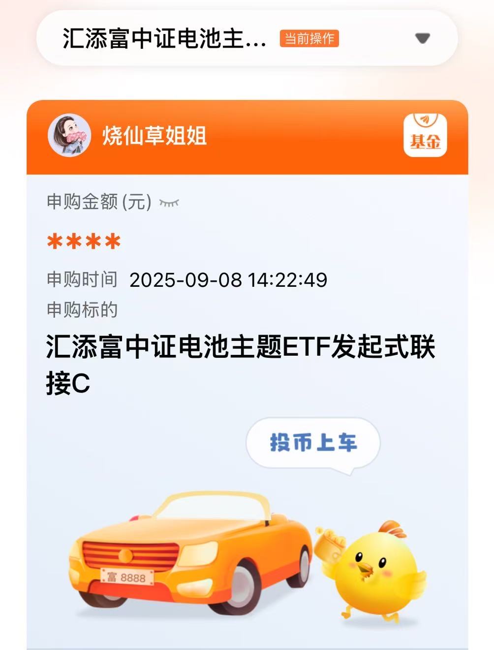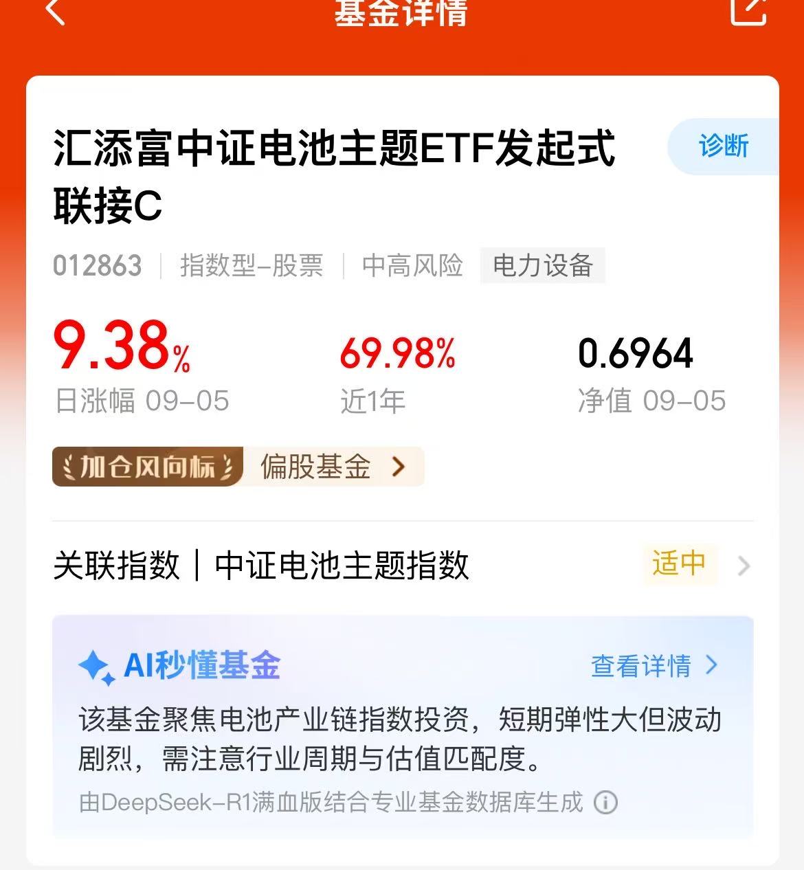 我今天也布局$汇添富中证电池主题ETF发起式联接C(OTCFUND|012863)$目前估值上涨2.36%,上周五上涨9.38%,近一周涨幅13.64%,同类排名领先,年化收益率69.98%,业绩优秀,盈利强,而且综费率是同类指数中最低的。这是紧密跟踪中证电池主题指数的,重仓股涵盖宁德时代、阳光电源、亿纬锂能等龙头企业,这可都是新能源天王呢,我觉得现在的电池就是前期的光模块和芯片了,再加上我们国家也持续加大对新能源产业的扶持力度,出台多项补贴政策,固态电池等技术不断的突破,我觉得未来可期,今天布局起来,继续看好涨势!