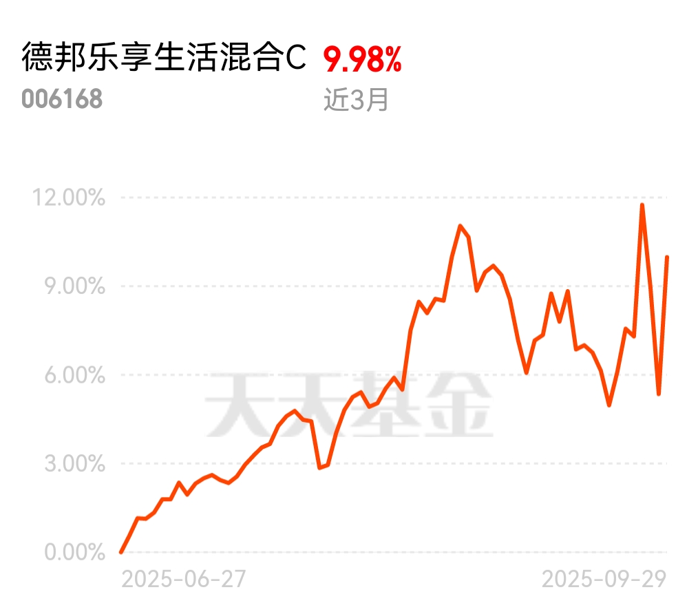 最近固态电池板块特别火,沾边的基金基本都有不错涨幅!德邦乐享生活混合 C 今天直接涨 2 个多点,表现挺亮眼,关键它还布局了固态电池,目前估值看着还能涨 2 个多点,坐等晚上更新收益!$德邦乐享生活混合C$