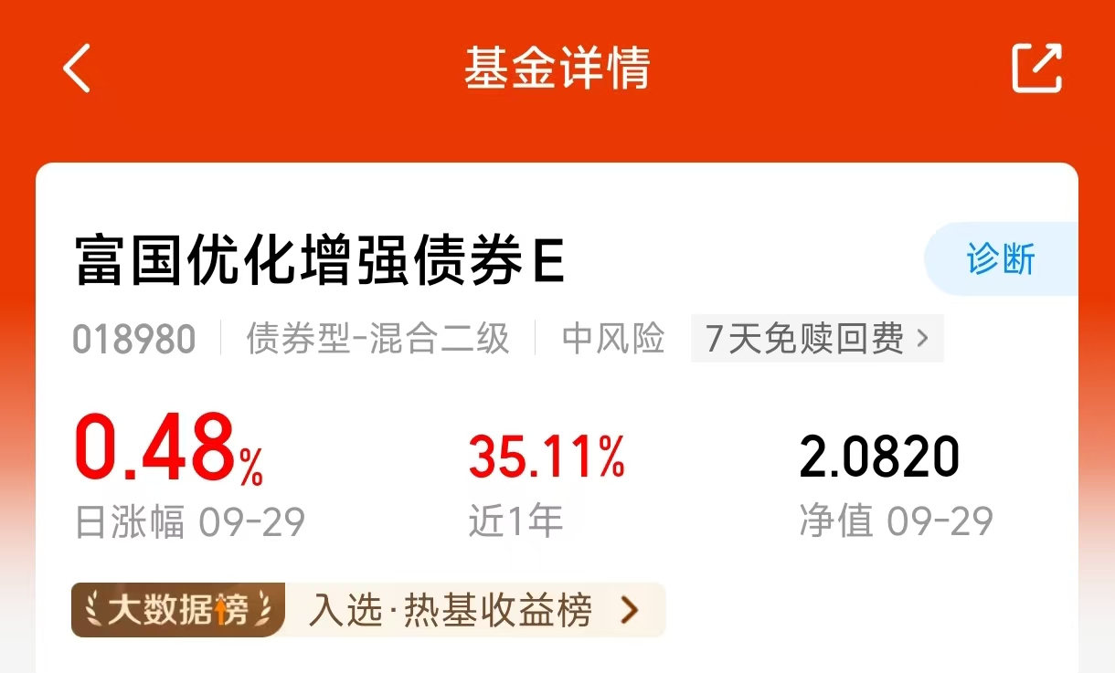 其实讲真的,创新药其实也不错,今天又开始涨了。我是买$富国优化增强债券E$(018980)这个,主要是这基金有6成仓做增强,做的主要就是科技和创新药,而且它有4成债仓,有积累,波动小也更稳。#分享国庆见闻,晒收益,瓜分好礼!#