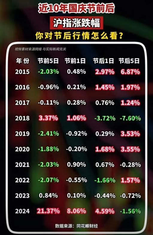 数据显示,国庆节后,沪指第一天上涨概率70%,节后五个交易日上涨概率60%