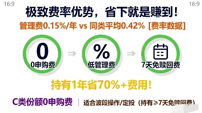 • 管理费0.15%/年vs 同类平均0.42%[费率数据],持有1年省70%+费用!