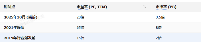先看数据(截至2025年10月):国内电池板块(以申万电池指数为例)当前市盈率(TTM)约28倍,市净率约3.5倍;对比2021年峰值时的65倍PE、8倍PB,已经腰斩;但比2019年行业爆发前的15倍PE、2倍PB,还是有一定溢价。不过这里要注意“分化”——头部企业和中小公司的估值差拉得很开。