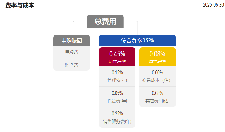 该基金综合费率为0.53%,其中显性费率(经营费率)为0.45%,隐性费率为0.08%