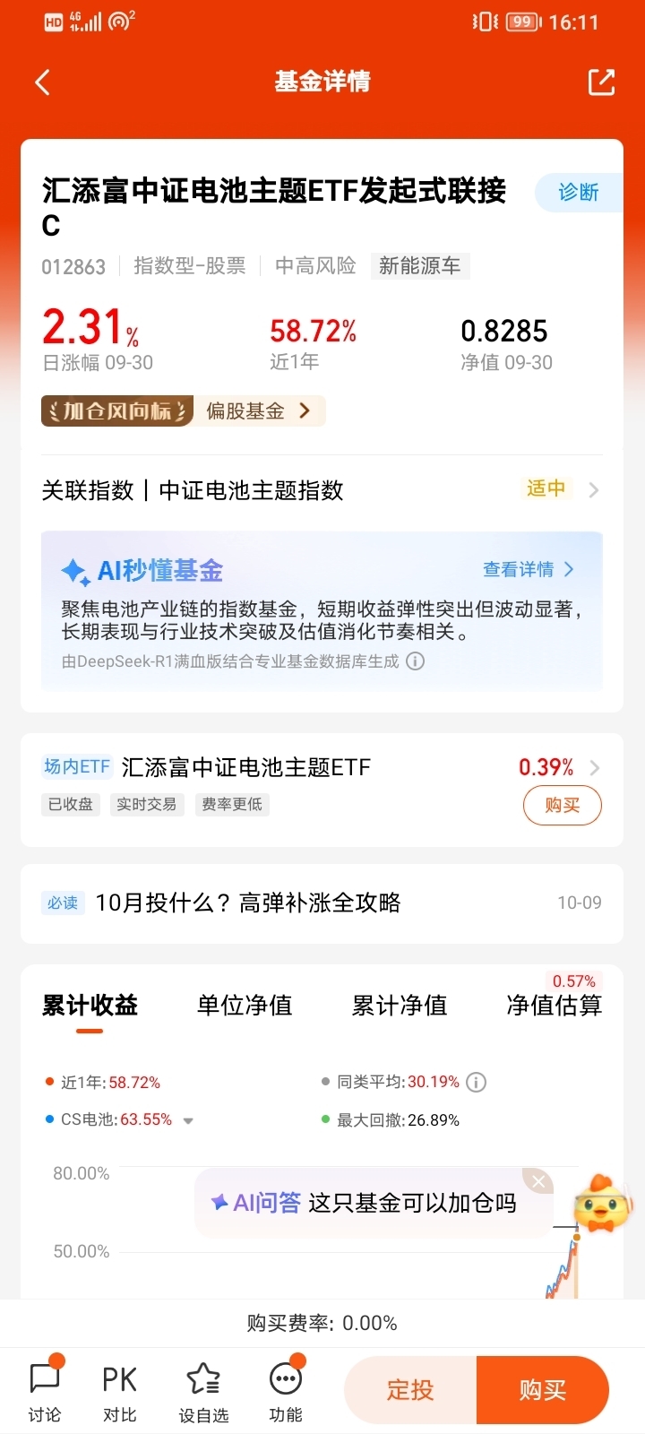 新能源电池行业正处于政策托底、技术突破、需求共振的黄金周期,固态电池和储能是未来5-10年的核心增长极。汇添富中证电池主题ETF联接C凭借低成本、宽覆盖的特性,适合普通投资者通过定投参与行业红利。当前板块估值(PE-TTM 25.94倍)低于历史中位数(44.41倍),安全边际较高,中长期看好,短期需耐心。@汇添富基金