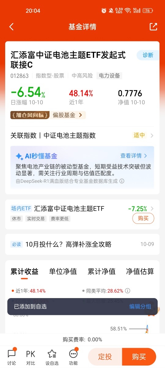 当然,投资该基金也存在一定风险。电池行业竞争激烈,技术更新换代较快,如果相关企业在技术研发和市场竞争中落后,可能会影响基金的表现。此外,宏观经济环境和政策的变化也可能对电池行业产生影响,进而波及基金的收益。但综合来看,汇添富中证电池主题ETF联接C基金凭借其专业的管理团队、明确的投资目标以及对电池行业的深度布局,仍是我眼中投资新能源板块的优质选择之一。@汇添富基金