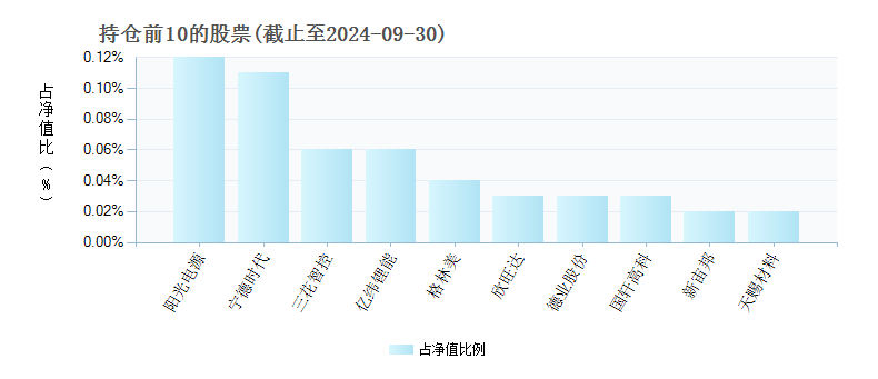 前十大成分股方面,截至2024年9月30日,该基金前十大重仓股包括阳光电源、宁德时代、亿纬锂能、三花智控、格林美、欣旺达、国轩高科、德业股份、新宙邦和天赐材料,合计占基金净值比例约0.55%。从权重来看,阳光电源(0.12%)和宁德时代(0.11%)为前两大重仓股,其余成分股权重均较低。