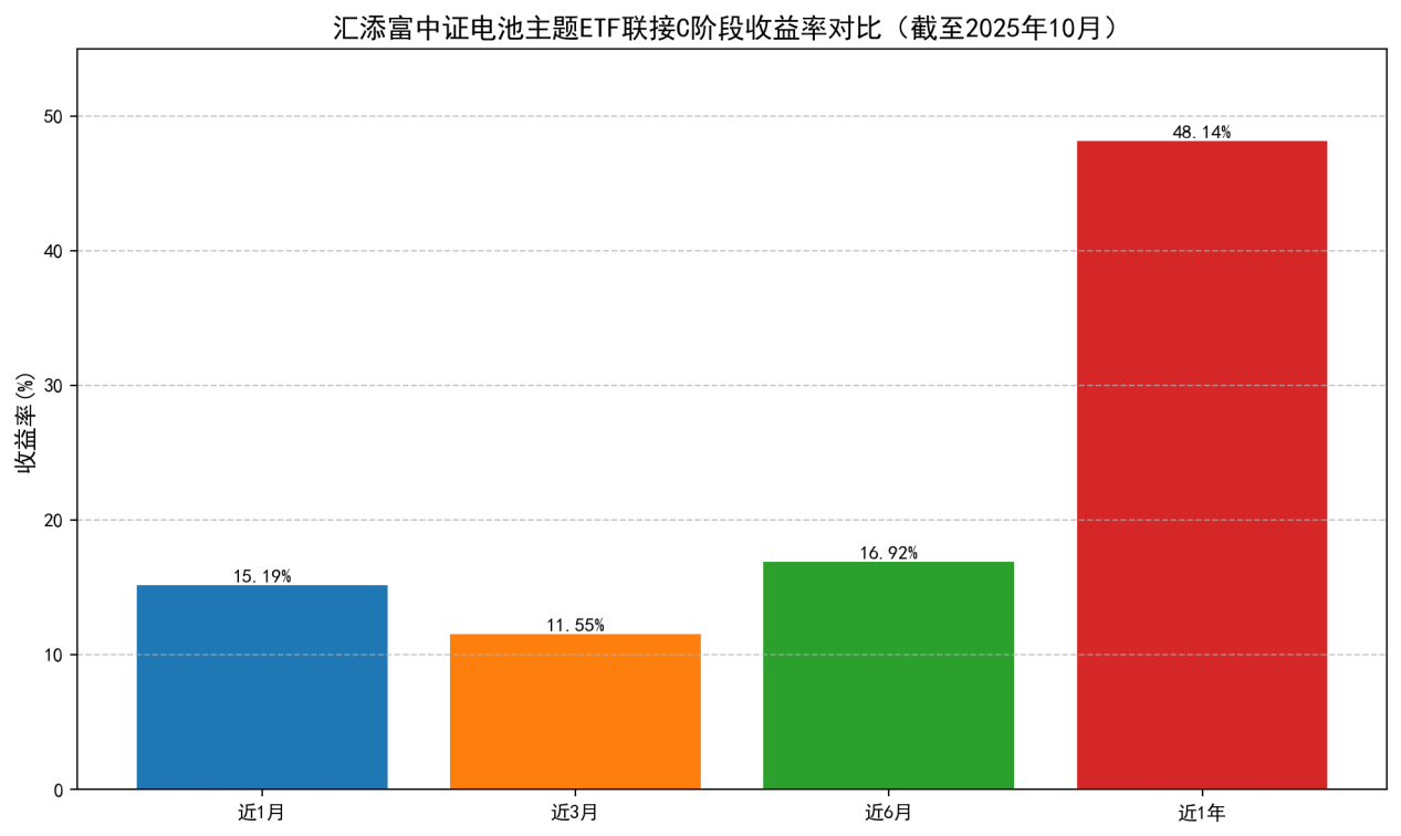 汇添富中证电池主题ETF发起式联接C基金(012863)展现出显著的阶段性收益特征,其表现与电池行业的技术迭代和政策驱动高度相关。截至2025年10月,该基金近一年净值增长率为48.14%,与跟踪的中证电池主题指数(931719.CSI)涨幅基本匹配。从短期表现来看,近3个月收益率为11.55%,而近1个月受政策利好推动,收益率达到15.19%,显示出较强的短期爆发力。