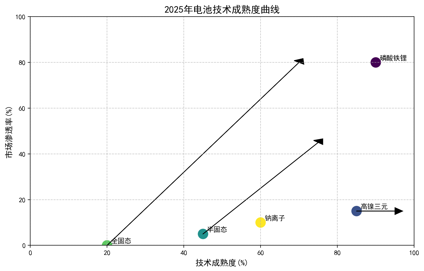 技术突破构成更根本的成长动能,可通过技术成熟度曲线清晰呈现不同技术路线的商业化进程。当前锂离子电池仍占据主导地位,但技术路线显著分化:磷酸铁锂电池凭借0.35元/Wh的度电成本在中低端车型及储能系统占据80%市场份额,而高镍三元电池通过能量密度突破300Wh/kg坚守高端市场。更具颠覆性的固态电池技术已进入产业化关键期,清陶能源的"固态电解质膜"技术实现GW级量产,卫蓝新能源通过界面改性将循环寿命延长至3000次,预计半固态电池将在2025-2027年规模化应用于高端乘用车,全固态电池则有望在2028年后实现500Wh/kg能量密度。钠离子电池作为补充路线,其能量密度提升至120-150Wh/kg,在储能领域成本较锂电池降低30%,2025年产量同比增长显著。