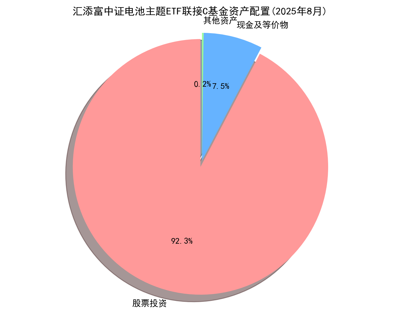 汇添富中证电池主题ETF发起式联接C基金采用典型的被动指数化投资策略,其资产配置严格遵循跟踪中证电池主题指数的要求。截至2025年8月,基金资产中股票投资占比达92.3%,现金及等价物占比7.5%,其他资产占比0.2%,这一配置结构充分体现了其作为联接基金的特性——通过高比例投资于目标ETF实现对标的指数的紧密跟踪。从动态调整来看,基金在2025年二季度末曾将股票仓位降至89.7%,以应对电池原材料价格波动带来的市场风险,随后在三季度随着行业回暖逐步加仓至当前水平,展现了较为灵活的仓位管理能力。