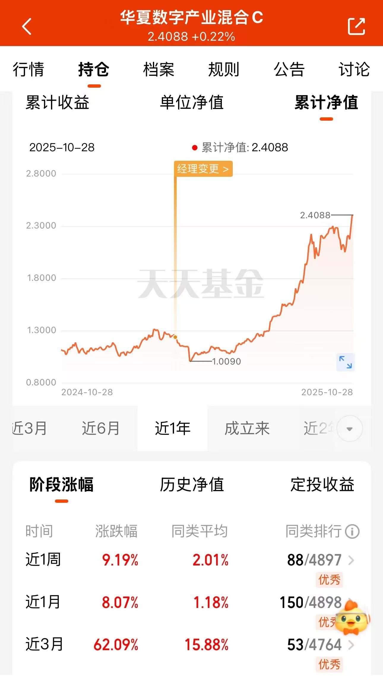 我看$华夏数字产业混合C$已经创近一年新高啦,最近一周收益9.19%,确实牛哈!