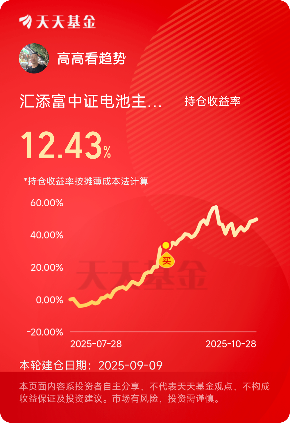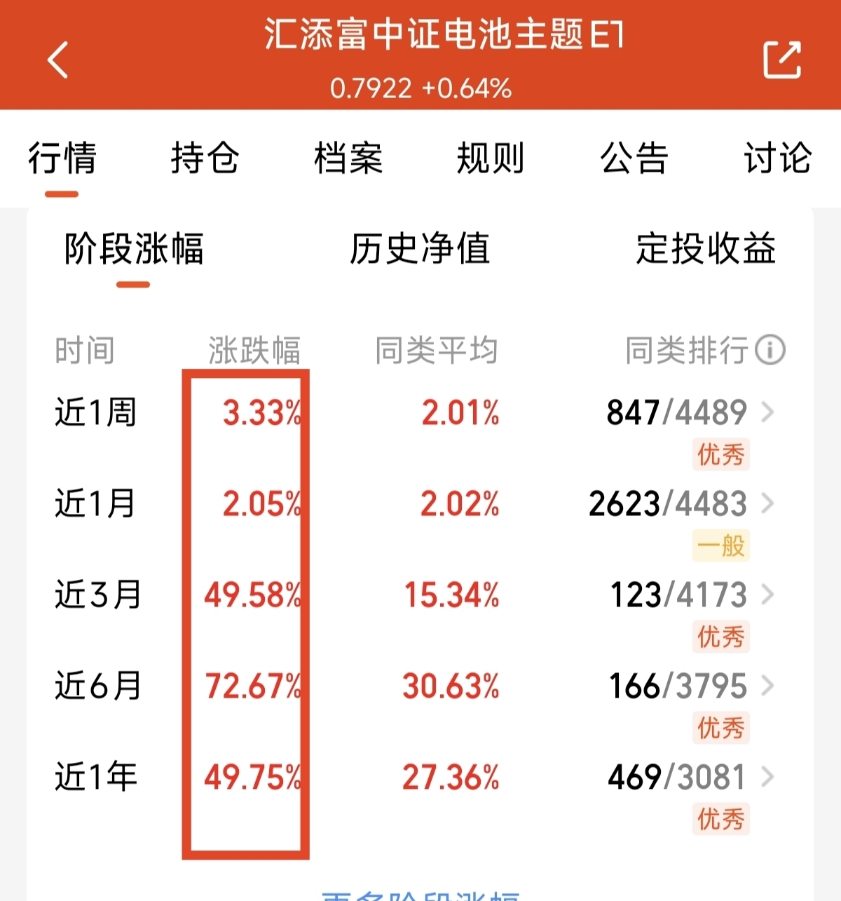 持有的$汇添富中证电池主题ETF发起式联接C$ ,紧密跟踪CS中证电池指数,覆盖动力电池、储能电池、消费电子电池全产业链,还纳入了格林美等电池回收企业,能充分享受电池行业各环节发展带来的红利!而且对比其他电池指数,中证电池指数成分股更优质更集中,锐度高,弹性更大,CSI有25%的储能概念,龙头阳光电源是我们的第一大权重股占比达15%,这是其他电池指数没有的,而且新能源四大天王阳光电源、宁德时代、亿纬锂能、先导智能都是前十大重仓!基金紧跟指数的表现也是一直不错,昨天又上涨0.64%。又是连续四天连涨,近3月上涨49.58%。是同类电池基金平均业绩的三倍还多。近半年上涨72.67%。稳稳抓住了本轮电池行情中固态电池跟储能电池的热点。而且费率方面,综合费率仅0.45%,同类也是最低,性价比更高,我目前稳稳持有。收益体验感一直不错。趁着大盘进入新的上涨平台,电池主线行情全面启动,我准备继续补仓!