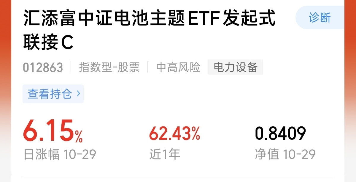 持有的$汇添富中证电池主题ETF发起式联接C$ 紧密跟踪CS中证电池指数,覆盖动力电池、储能电池、消费电子等,几乎打包了电池上下游产业链,还纳入了格林美等电池回收企业,整体也是更全面。而且对比其他电池指数,中证电池指数成分股更优质更集中,CSI有25%的储能概念,龙头阳光电源是我们的第一大权重股占比达15%,这是其他电池指数没有的,而且新能源四大天王阳光电源、宁德时代、亿纬锂能、先导智能都是前十大重仓!从业绩表现来看,昨天又上涨6.15%。稳定做到了5天连涨。近3月上涨58.06%。是同类电池基金平均业绩的三倍还多。今天估值再次上涨了2.32%。稳稳抓住了本轮电池行情中固态电池跟储能电池的热点。而且费率方面,综合费率仅0.45%,同类也是最低,性价比更高,我目前稳稳持有。收益体验感一直不错!目前来看电池板块主线已经回归。而且估值整体不高。我准备继续补仓。#晒收益#