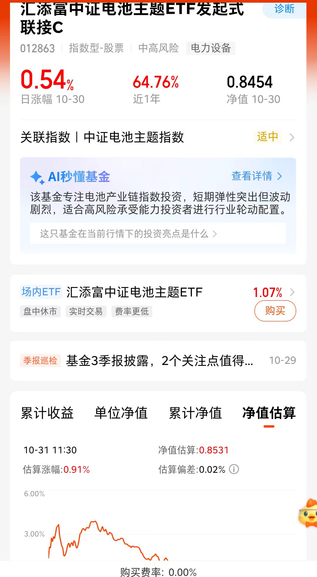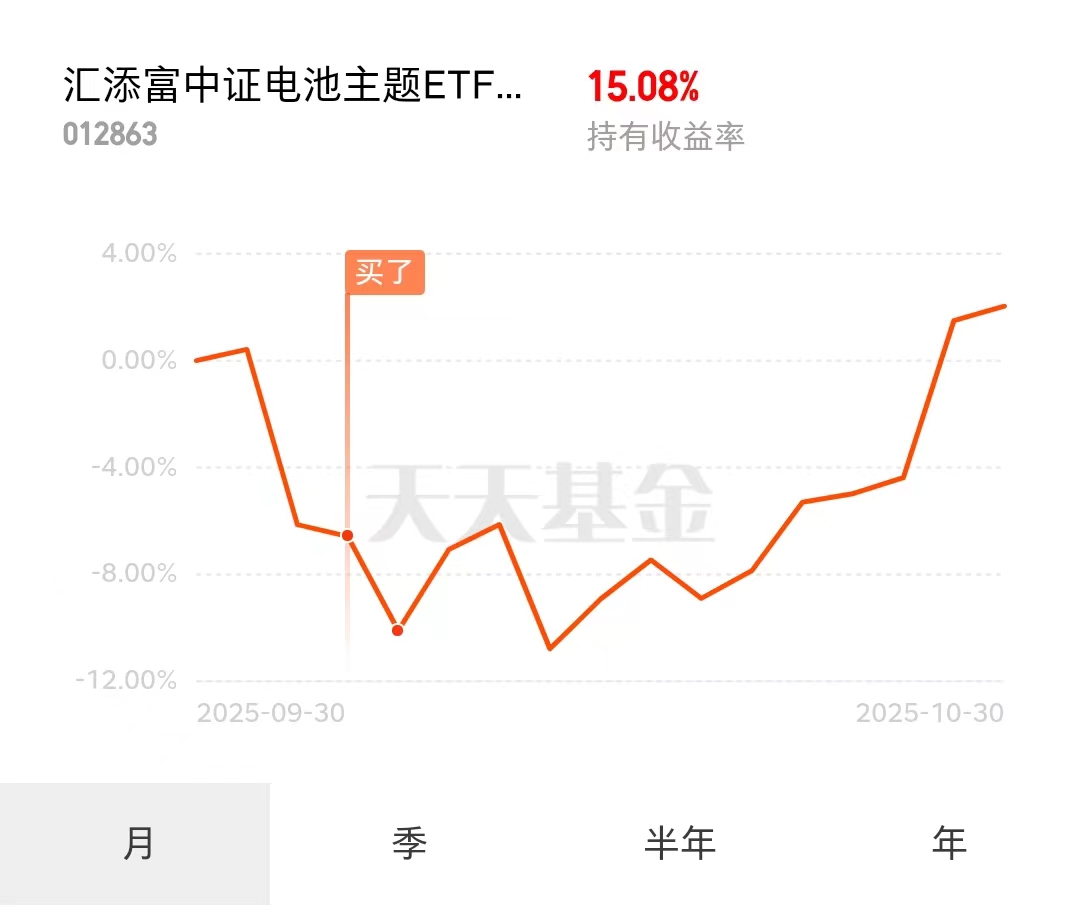 这两天股市行情冲高回落,震荡走势,板块分化。但是固态电池板块随着储能需求持续高涨,以及产业化进程加速,迎来了反弹行情,而且根据历史经验显示固态电池板块修复速度和空间还是值得期待的。而且从基本面看,储能电池需求是超预期的:国内储能商业模式逐步清晰,叠加欧洲碳排及新兴市场储能需求增长,推动电池需求端扩张。电池板块正在走出基本面低谷,供需两端持续改善。我就是加仓了$汇添富中证电池主题ETF发起式联接C(OTCFUND|012863)$,他跟踪CS电池931719.CSI,有25%的储能概念,而且他的持仓里比别的指数多了新能源四大天王之一的阳光电源,更有优势,他锐度高,弹性大,而且综合费率仅为0.45%,同类最低,持仓体验不错。