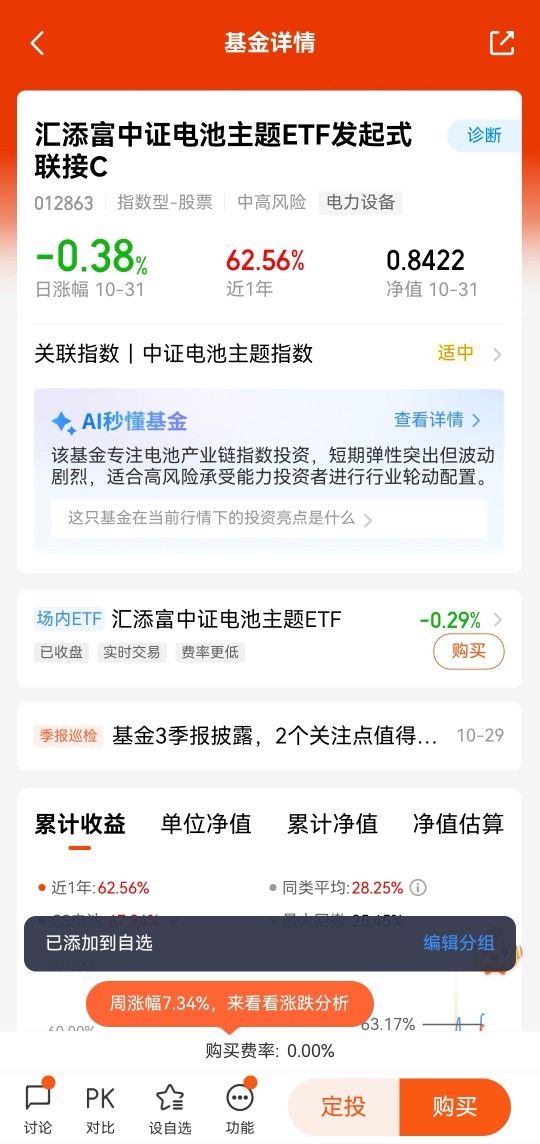 于是在整个十月份里,也是加强了对于新能源板块的关注,事实证明,当年的王者归来了,核心技术接连突破,政策持续加强对新型能源产业的发展指引,加上估值洼地,多重驱动,新能源借此机会迎来反转投资机会,归家沿途的充电桩也为新能源车的宏大布局提供设备支撑,更何况新能源产业不仅只局限于新能源车这一块,更多地应用场景、更持久的续航等这些不断给予新能源产业回馈与支撑,让投资也更有目的性,$汇添富中证电池主题ETF发起式联接C$ 跟踪中证电池主题指数,“懒人式”的跟踪产业发展机遇,得势优行。