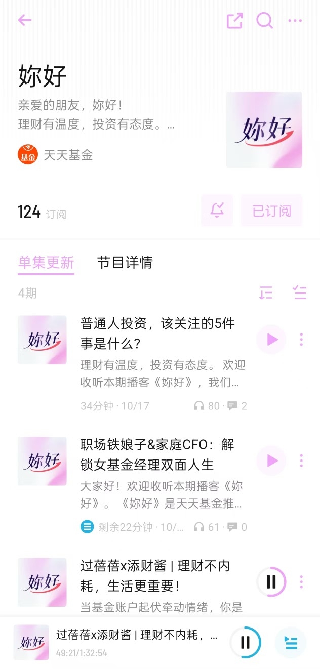 小宇宙APP的播客×天天基金栏目专栏也是一个闲时解乏工具,通过听取基金经理的一些真实声音,也让我对生活与理财更加得心应手,后续个人也会持续跟进播客音频的学习,理财不内耗,生活依旧~@汇添富基金