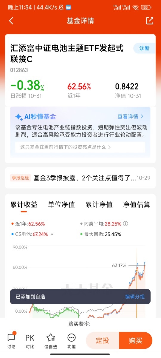 就拿我持有的汇添富中证电池主题ETF发起式联接C来说,当初买它纯属“随缘”。听身边人说现在新能源汽车越来越多,家家户户都在装充电桩,电池肯定是刚需,我就随手买了点,之后再也没管过。至于那些热点板块,比如前阵子炒得火热的AI、半导体,还有一直起起落落的消费、医药,我连它们具体是做什么的都没弄明白,更别说跟着追涨杀跌了。
