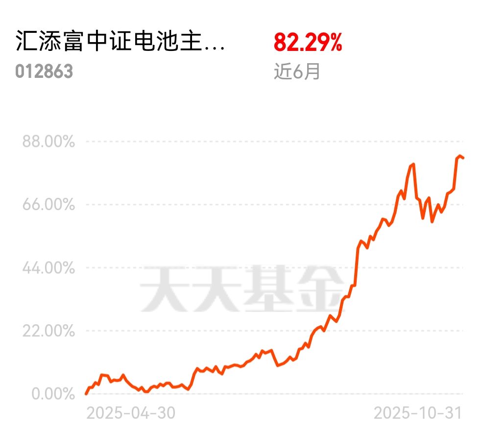 我比较看好这只$汇添富中证电池主题ETF发起式联接C$ ,跟踪中证电池指数,一键布局储能、动力、消费电子等细分板块,和市场同类指数相比,更侧重储能配置,需求确定性高,而且近一周已经涨了7.37%,近半年收益82.29%,跑赢大多数板块了,而且目前电池板块也是少数有基本面支撑的,科技板块高位之际,我觉得也能承接部分溢出资金;