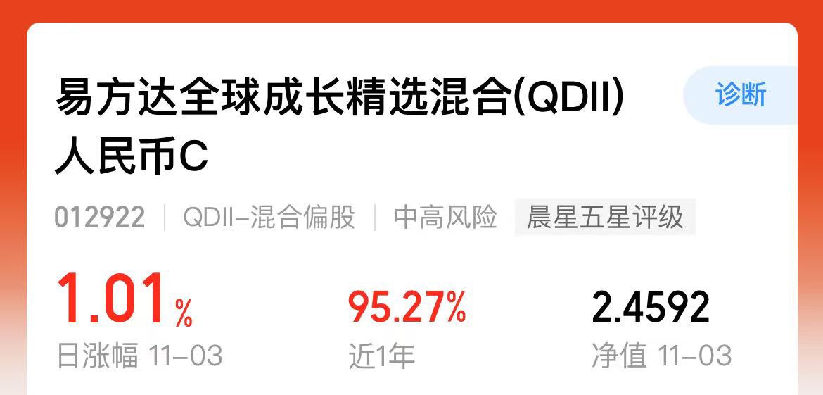 全球科技今天震荡分化,美股AI概念股回调,港股互联网龙头展现出强韧性。A股算力基础设施板块迎来资金关注,降息周期中,科技资产长期配置依然可行。我关注的$易方达全球成长精选混合(QDII)人民币C$ 表现亮眼,业绩稳定,昨天涨1.01%,近一年涨幅95.27%,赶紧记下来关注!