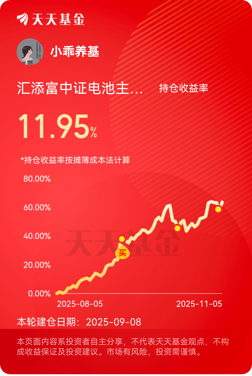 刚看前天加的$汇添富中证电池主题ETF发起式联接C$ 又吃大肉了,昨天就涨了3.48%,今天继续涨1.95%,也太牛了吧,我的收益目前也有11.95%了,买了这只基确实不错,主要是它的电池跟踪成份股质地最好,阳光电源含量高,新能源四大天王(阳光电源、宁德时代、亿纬锂能、先导智能)都是前十大成分股),这些都是很优质的龙头企业,业绩非常的优秀,近3个月反弹力度非常大,达到了63.72%,同类平均+14.16%,足足高出了快50%,强者恒强,排名确实是相当优秀的,近1年和近6个月汇添富电池涨幅也是相当高的,费率也有优势,买入0申购费,满7天卖出0赎回费,真不错。