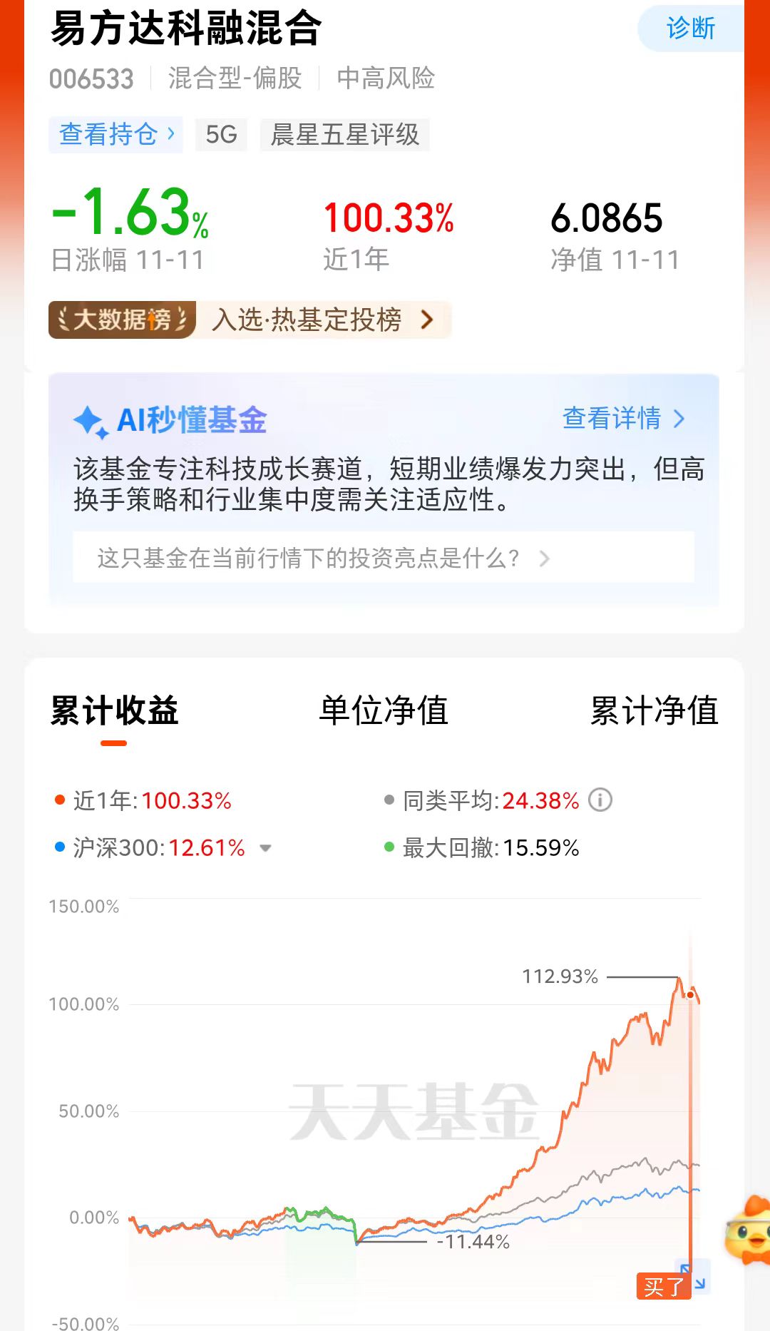 最近股市行情有些震荡,沪指几次涨超4000点后都会调整,所以说均衡配置也是应对震荡的一种有效方法呢。易方达科融混合就是布局了科技,新能源,军工等板块,不惧怕板块轮动,基金经理能力强,回撤控制的好,业绩优秀,跑赢同类呢。