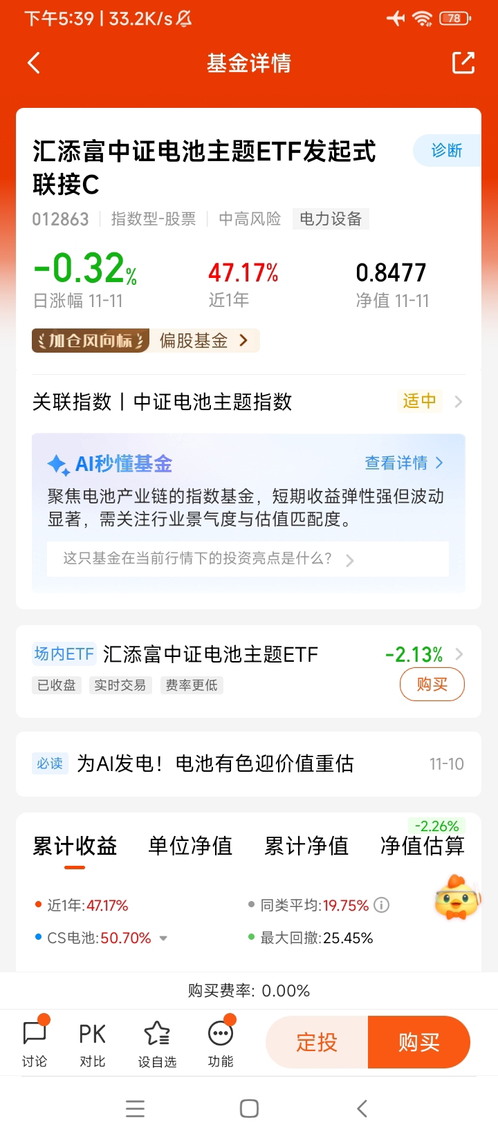 在这样的背景下,汇添富中证电池主题ETF发起式联接C作为精准跟踪电池赛道的优质工具,投资价值不言而喻。对我而言,这只基金并非短期投机的选择,而是长期资产配置中不可或缺的核心标的。目前,我已做好充分准备,计划采用“定投+逢低加仓”的策略积极配置:每月固定投入一笔资金,锁定长期收益;当市场出现阶段性回调、基金净值回落时,择机追加投资,进一步摊薄持仓成本,提升长期收益空间。我坚信,随着时间的推移,储能与AI电力双轮驱动的增长红利将逐步兑现,这只基金也将为投资者带来丰厚的回报。