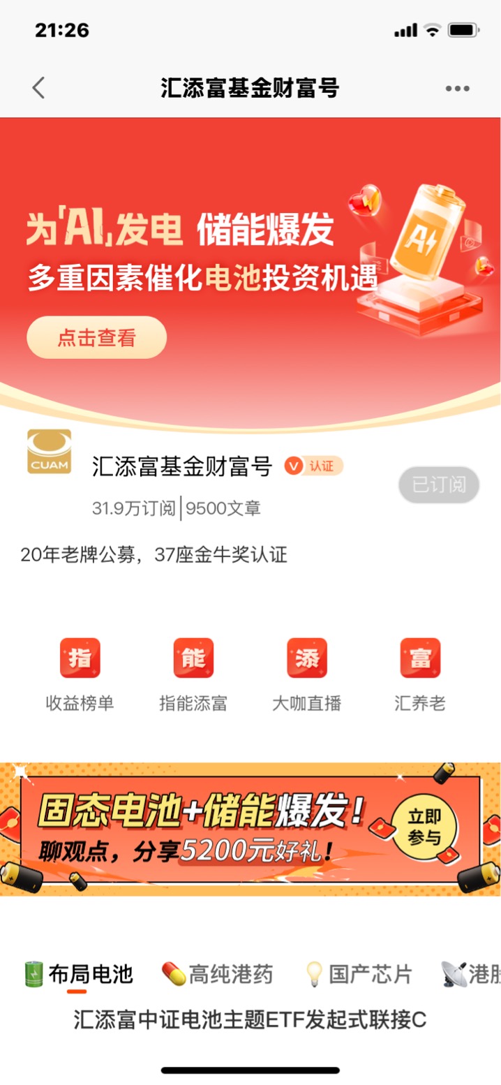 在投资的世界里,总有一个领域像被一股看不见的能量驱动着,不断释放出新的火花。最近,电池赛道毫无疑问就是这样一个焦点。随着储能技术的蓬勃发展以及人工智能对电力需求的激增,电池板块的关注度持续升温。作为一个初入职场的年轻人,我起初对基金投资知之甚少,但参加了这次基金公司的征文活动后,我对中证电池主题指数及相关产品如$汇添富中证电池主题ETF发起式联接C(OTCFUND|012863)$有了更深入的思考。今天,我想从个人投资者的角度,聊聊这个话题。