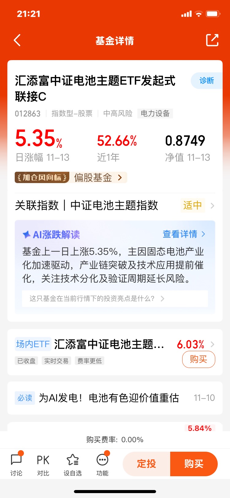 现在,说说$汇添富中证电池主题ETF发起式联接C(OTCFUND|012863)$。作为一支指数型股票基金,它吸引我的地方在于多个方面。首先,管理团队和产品矩阵的支撑很强。汇添富作为老牌基金公司,有丰富的指数产品经验,这为基金的稳定运作提供了保障。基金经理董瑾女士的投研背景也让我印象深刻。她有多年指数投资经验,专注于量化分析和行业研究,能够精准把握电池主题的动向。从历史表现看,这只基金追踪中证电池主题指数,过去的表现与指数基本同步,显示出较好的跟踪能力。投资方法论上,它采用被动管理策略,目标是复制指数的收益,避免了主动选股的主观风险。对于我这样的新手来说,这种方式简单明了,不需要我天天盯盘。投资经验方面,基金成立以来,运作平稳,机构持仓占比合理,反映了专业投资者的认可。行业配置上,它高度聚焦电池主题,底层资产配置清晰,业绩比较基准就是中证电池主题指数,这让我一目了然。投资风格偏向稳健,适合长期持有。总的来说,这只基金的投资机会主要体现在:一是能让我低成本地参与电池赛道,无需自己选股;二是通过指数化分散风险,避免了单一个股波动;三是有专业团队管理,省心省力。当然,它也有风险,比如市场整体波动或指数表现不佳时,基金净值会受影响。但结合当前电池行业的势头,我认为它是个不错的工具,尤其适合像我这样想长期布局的新手。