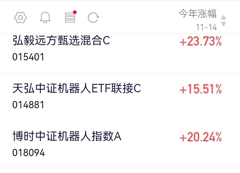 市场近期走势平稳,机器人板块表现突出。弘毅远方甄选混合C 今年涨了23.73%,跑赢99%同类,实力能打。规模不大操作更灵活,趁着行情正好,我准备果断布局一波!$天弘中证机器人ETF联接C$ 今年涨幅15.51%$博时中证机器人指数A$ 今年涨幅20.24%还可以