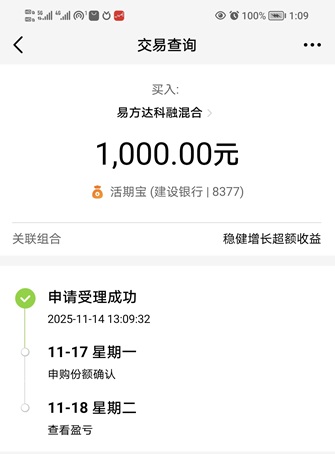 2.新兴科技:我今天继续加仓$易方达科融混合(OTCFUND|006533)$1000元。它聚焦科技成长赛道,重点布局了电子、通信、电力设备等,通过行业分散与个股精选构建投资组合,深耕科技成长,业绩突出。基金经理刘健维自2020年6月任职以来,累计回报达到294.77%,平均年化收益26.96%,远超同期上证指数的沪深300等宽基指数的涨幅,显示出其卓越的管理能力。本基金近2年大涨156.35%,近6月涨102.40%,近3月涨33.53%,各时间周期都处于同类型产品的头部,表现非常优秀。另外本基金控制回方面同样优秀,A股进入十月以来出现了较为明显的回撤,本基金近1年最大回撤仅有15.59%,波动率28.8%,夏普比率为3.40,也优于99%的同类基金,确实是能打能抗的稀缺产品。难怪本基金深受机构投资者的喜欢,持仓比例超过50%。今天A股集体小幅回调,我认为是良性休整,中长期震荡上行的慢牛格局没变,科技仍是主线,本基金正好布局大科技,正是低吸加仓的好时机,我果断加仓它。下面我晒一下买入操作记录: