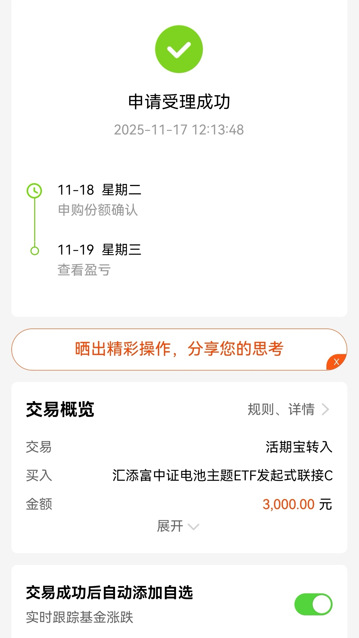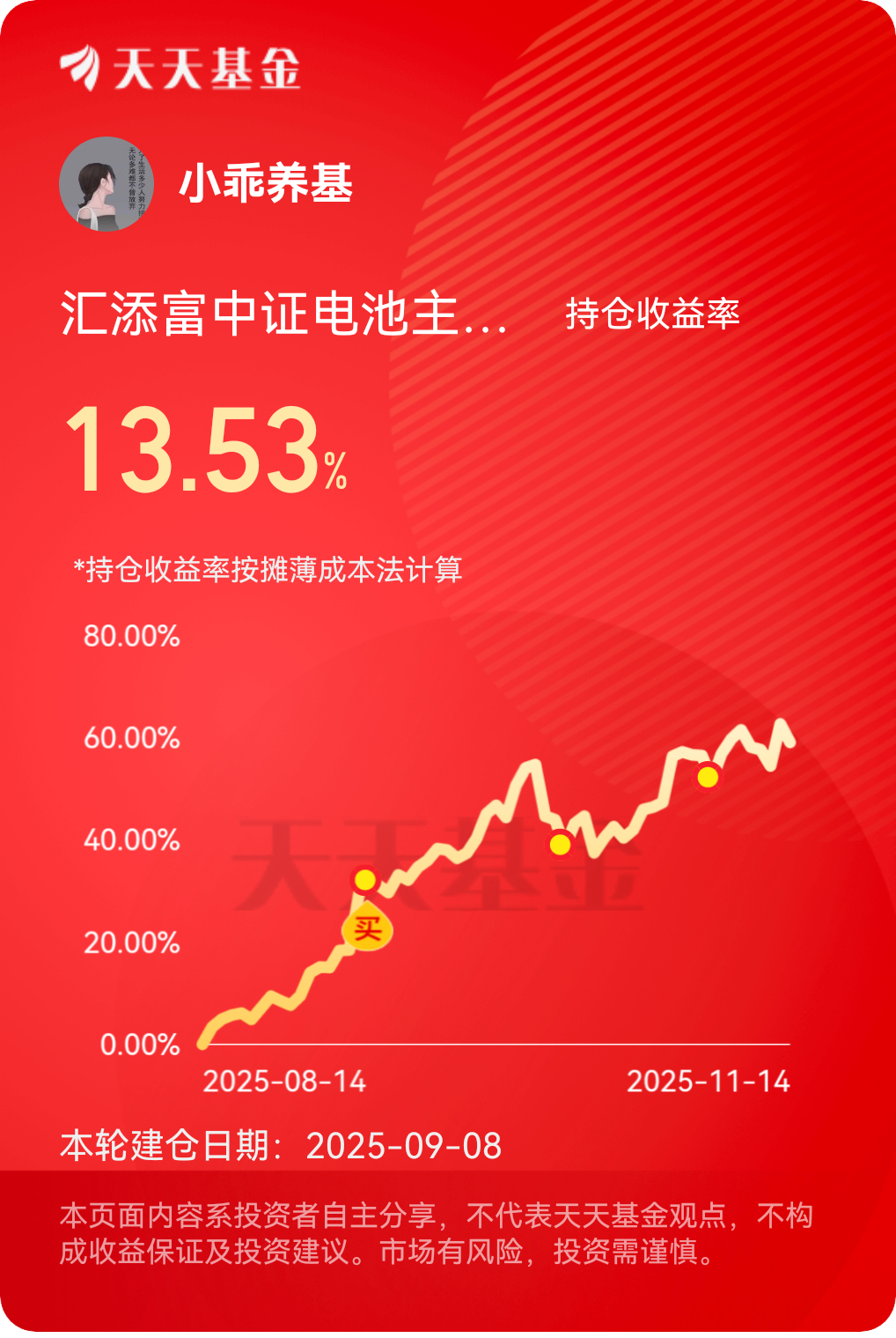 而且11月科技板块回调了不少,资金也逐步进入电池板块,锂电和AIDC概念持续发酵,电池行情有望持续,那我不等了,今天趁回调继续加3000元$汇添富中证电池主题ETF发起式联接C$这只基金跟踪中证电池主题指数,布局储能和固态双主线,精选50家锂电全产业链龙头,跟踪的CS电池931719.CSI有25%的储能概念,阳光电源是第一大权重股,权重接近15%,而其他指数没有阳光电源,业绩也很好, 近1个月反弹14.85%,近3个月反弹59.20%,近6个月反弹74.18%,近1年反弹53.79%,对比同类,固态电池含量达42%,锐度高,弹性也比较大, 最重要的同类产品全市场费率还是最低的综合费率仅0.45%,性价比很高,我的收益也有13.53%,这个位置可得拿住了。