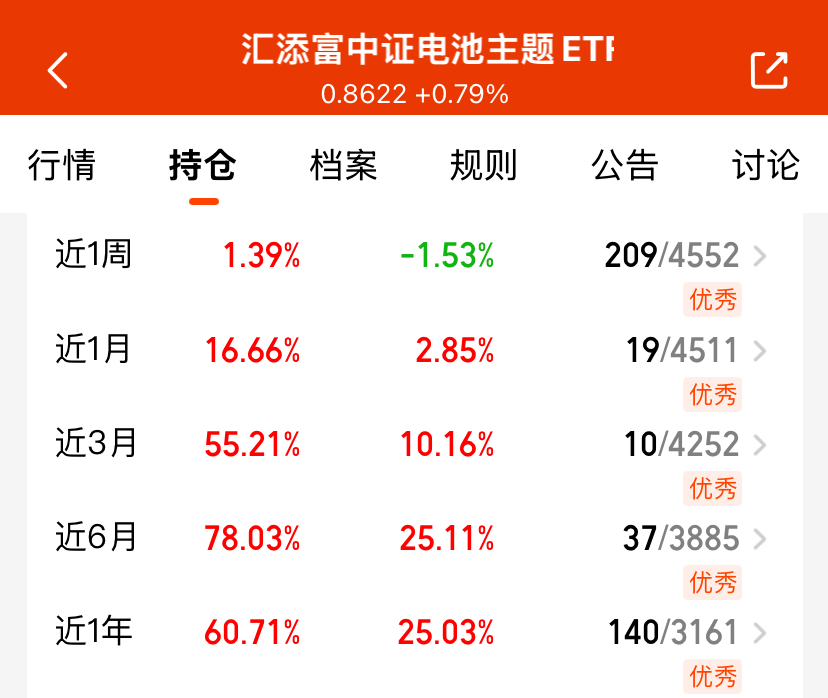 所以,今天趁着行情回落,我打算低吸埋伏一波,准备继续上车$汇添富中证电池主题ETF发起式联接C(OTCFUND|012863)$啦,它紧密跟踪中证电池指数,聚焦储能概念、阳光电源等潜力方向,覆盖宁德、亿纬等优质成长股,整体弹性十足,综合费率仅仅0.45%,基本上同类最低了,纵观其业绩,近一月涨幅+16.66%,近三月涨幅55.21%,近半年涨幅78.03%,随着“十五五”规划中强调新型储能与先进电池技术突破,算力中心建设催生海量备用电源需求扩增,电池赛道前景十分广阔,所以我今天顺势低吸捡筹码,耐心坐等行情归来带我吃肉啦!$博时ESG量化选股混合A(OTCFUND|018130)$$德邦半导体产业混合发起式C(OTCFUND|014320)$#今年买基金赚了多少钱?#