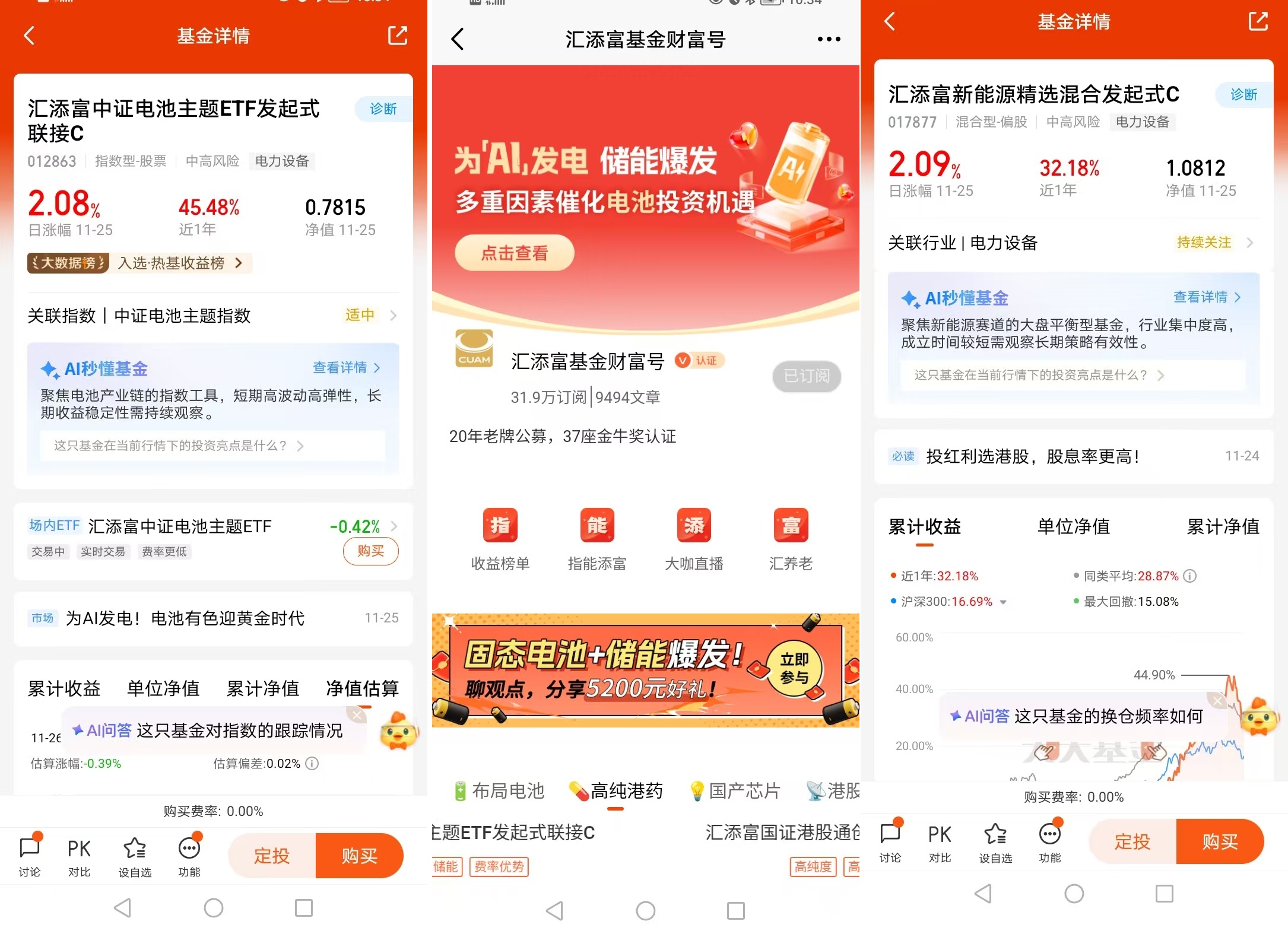 退休前在国营机械厂当机械密封工程师,跟机械零件、密封参数打交道三十多年。我们搞机械的都懂一个理:“好设备得靠好零件撑着,好零件得看材质和精度”,理财这事儿也一样,“鸡蛋不能放一个篮子里”,但更知道“好篮子才配装好鸡蛋”。以前买过银行理财,年利率从5%降到2%都不到;投过小区门口的“养老项目”,差点血本无归。从那以后我就打定主意,再投钱必须像检修设备似的,拆开来、看仔细,半点马虎不得。三年前,在银行工作的侄女给我推荐了这只汇添富中证电池主题ETF发起式联接C,说跟储能赛道沾边,我一研究就入了迷——储能设备里的电池管理系统,跟我们以前调试的密封控制系统,在“稳定性”上的讲究都一样,这大半年更是重点关注着,就等瞅个合适时机出手。