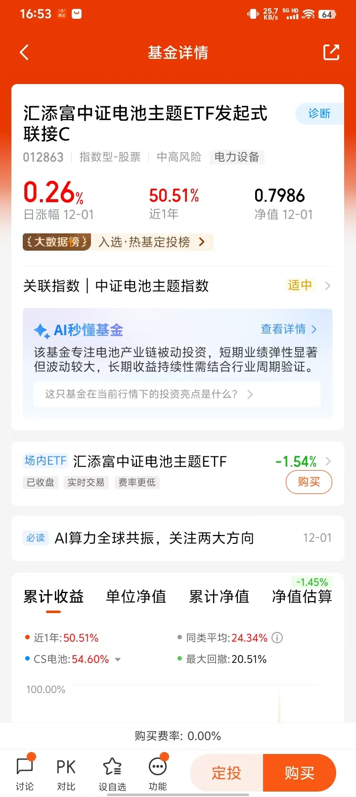 $汇添富中证电池主题ETF发起式联接C(OTCFUND|012863)