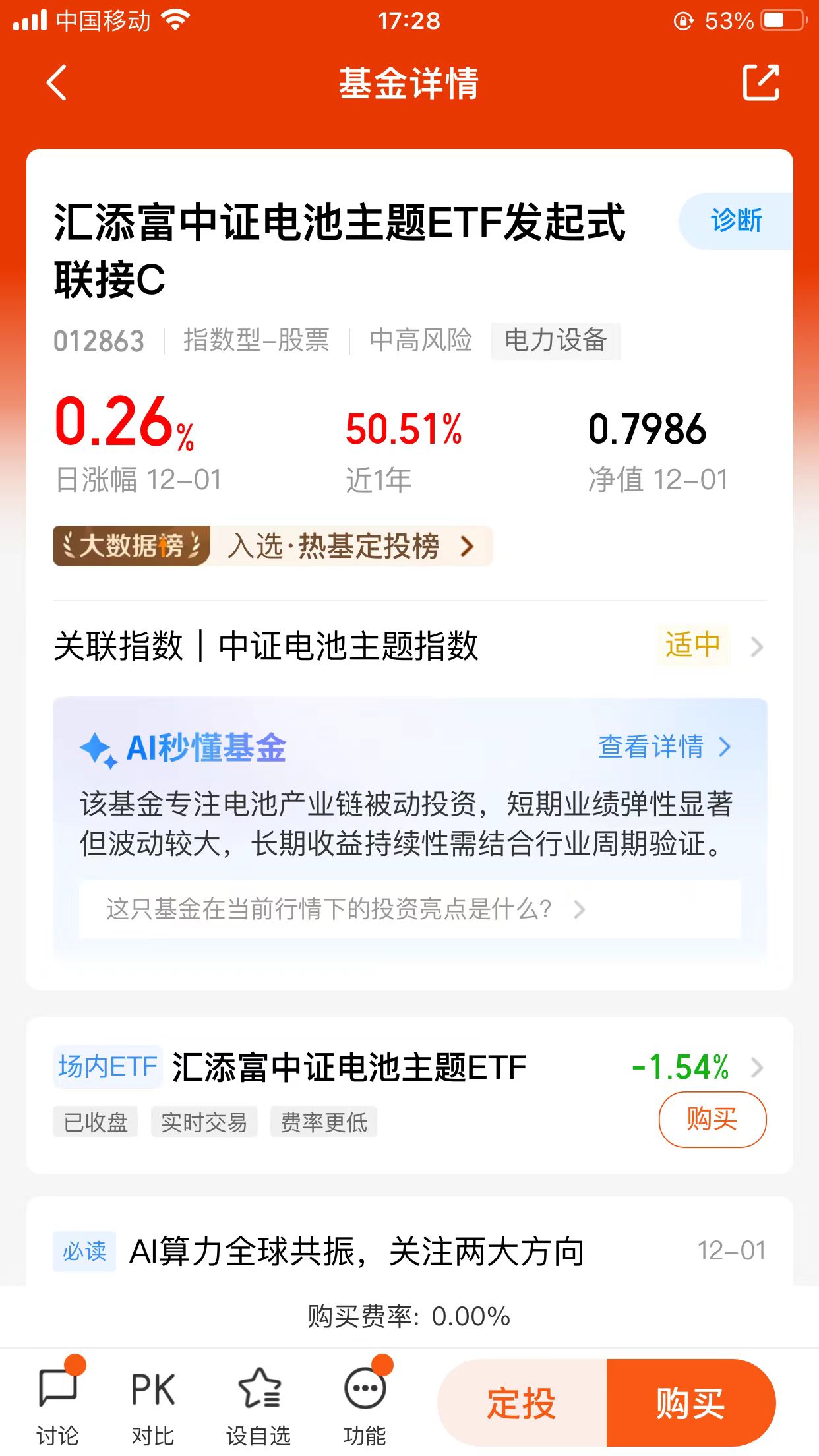 汇添富中证电池主题ETF发起式联接C(012863)是一款精准跟踪电池产业链、费率低廉、流动性佳的指数工具。尽管长期回报受行业周期制约,但当前估值低位叠加技术突破窗口期,为其提供了战略性配置价值。通过定投或分批建仓方式参与或能使我们的投资体验感更好!!!@汇添富基金