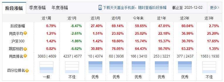 从上表可见,该基金在近三个月和近半年表现优异,均排名同类前2%,但近一月排名相对靠后,显示其波动性较大。