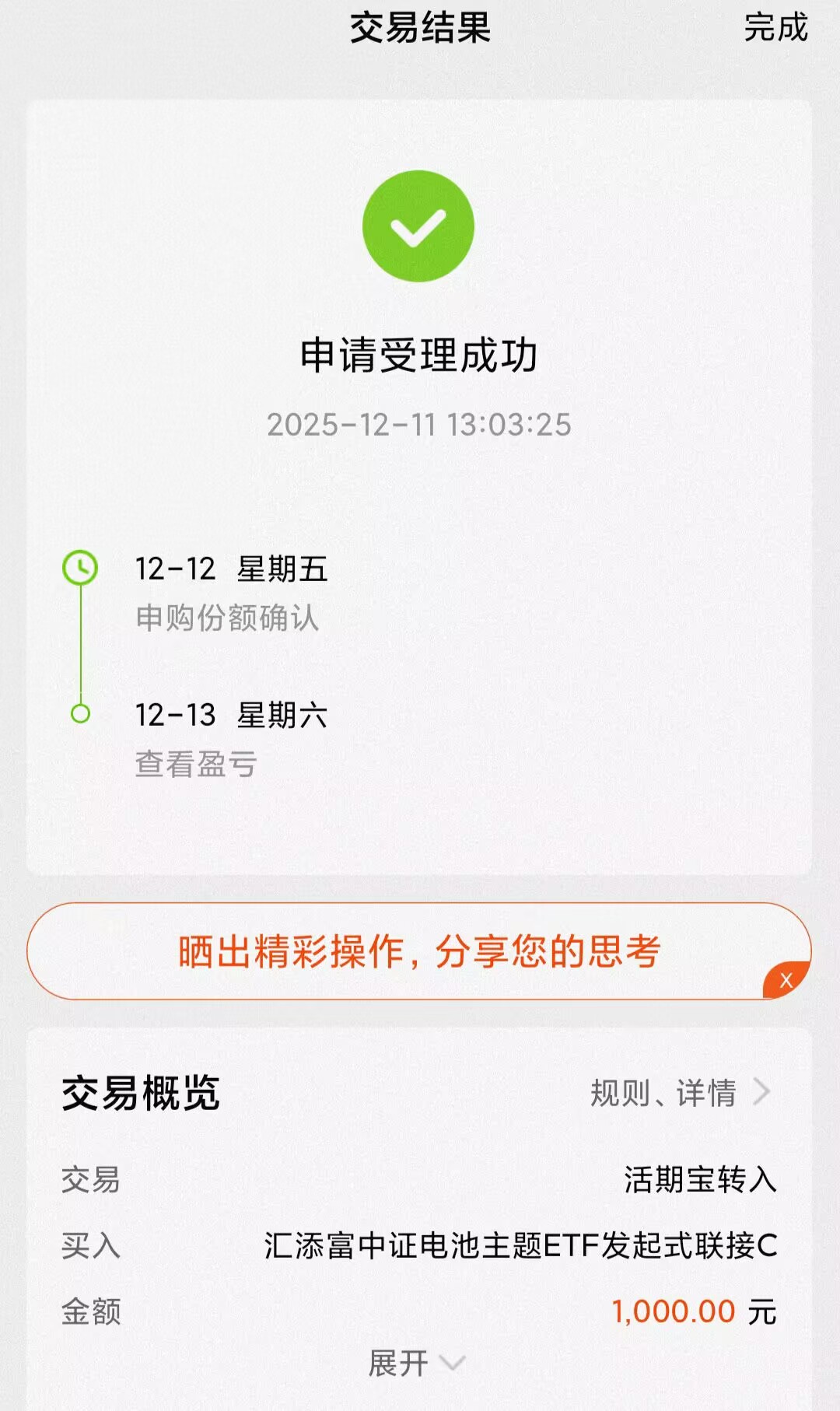 加仓1000元$汇添富中证电池主题ETF发起式联接C(OTCFUND|012863)$国内储能商业模式逐步清晰,叠加欧洲碳排及新兴市场储能需求增长,瑞银证券预测,储能行业将进入繁荣周期,2026年全球储能需求同比增幅或达40%,储能电池需求超预期,而中国储能市场将成为关键增长引擎,此外,固态电池商业化在即,可以说电池行业长期投资机会凸显,这个时候配置电池基金是省心且确定的做法。