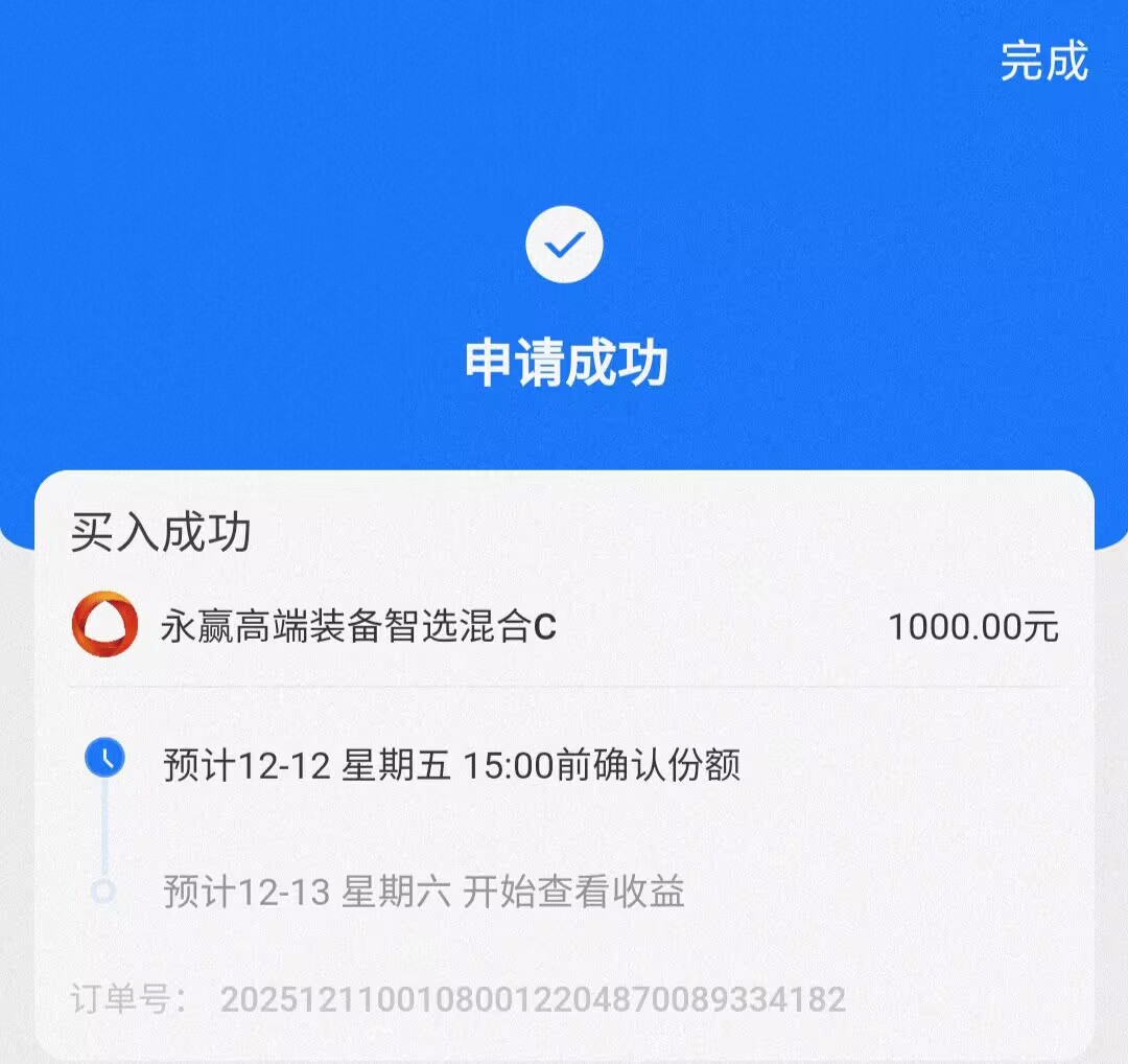 今天买入1000元$永赢高端装备智选混合发起C(OTCFUND|015790)$,这只基金太猛了,之前已经连续5天上涨,近一周就大涨10.56%,今天还在涨,净值6连涨, 很明显这个就是市场主线了,可能还有不少人还没有反应过来,不知道是哪个方向,其实这个方向就是商业航天、卫星互联网方向。