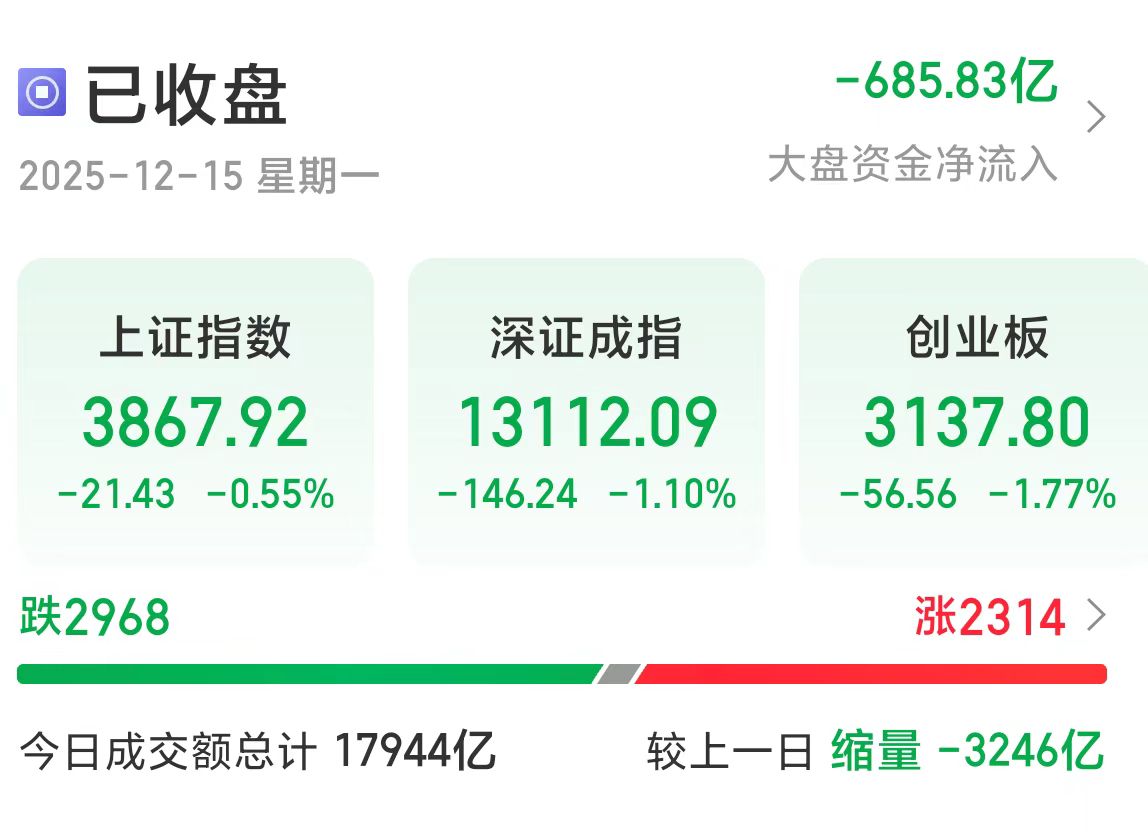 今天大A又玩起惊险过山车!早盘沪指直接低开24点,刚一波强势拉升让人以为要一路高走,10点40眼看要站稳5日、10日线,结果扭头就跳水,午后更是一泻千里走出大倒V,最终收跌0.55%。成交量缩至17944亿,少了3246亿,超2900只个股下跌——虽说比4000多只跌的时候看着体面点,但亏的钱是真没少!更绝的是社零数据不及预期,按理说该利空股市利好债市,结果债市直接暴跌,股债齐跌这操作也是绝了,显然资金宁愿在股市来回折腾,也不想去债市耗时间,算是给咱一颗定心丸,和去年12月行情不同。