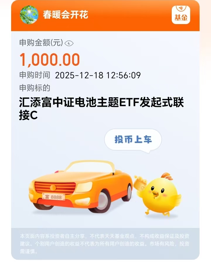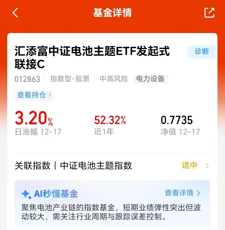 我之前入手的$汇添富中证电池主题ETF发起式联接C(OTCFUND|012863)$踩中储能+固态电池双主线,龙头集中度高。跟踪的CS电池指数聚焦50家锂电全产业链龙头,储能含量26%、固态电池含量42%,远超同类。第一大权重股阳光电源占比快15%了,比其他指数更有优势!0.45%的综合费率还是同类最低,性价比更高了。现在电池板块估值还处相对低位,叠加后期技术突破和全球订单大增,增长空间不小,趁今天回调我也补仓1000元,布局2026年春躁行情!