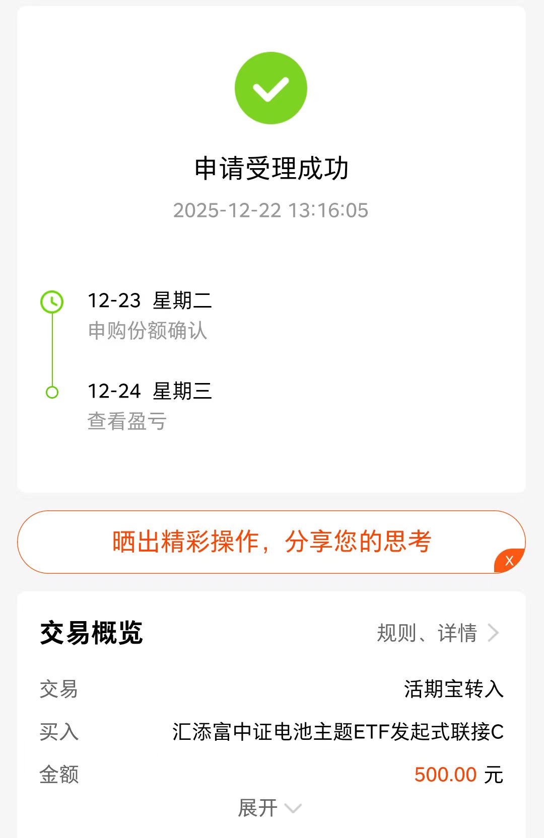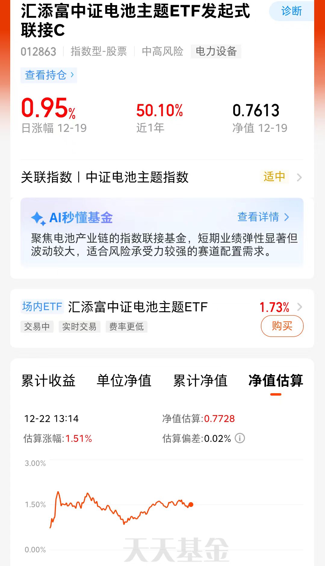 伙伴们。上周股市行情连续反弹了几天,这周反弹行情继续,今天大盘指数高开高走,盘中涨幅还在不断拉升。年底,大家调仓可能会比较频繁,板块轮动相对都会频繁一些,这也正是寻找机会布局新年行情的机会,抢筹春季躁动筹码我选$汇添富中证电池主题ETF发起式联接C(OTCFUND|012863)$,现在日本加息落地,利空基本已消化。春季行情有可能提前抢跑,布局高弹性成长板块胜率更高。