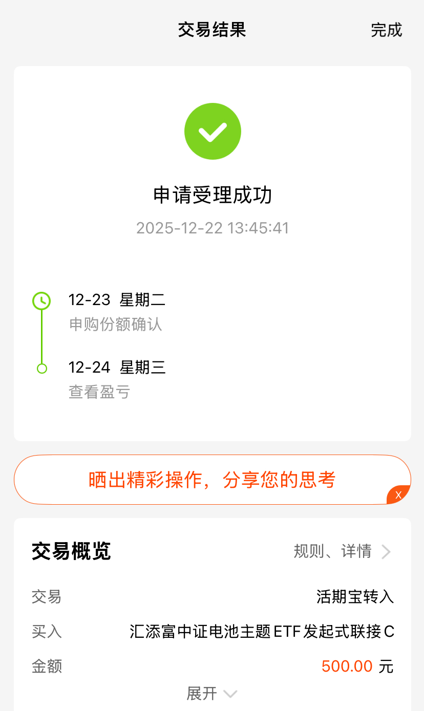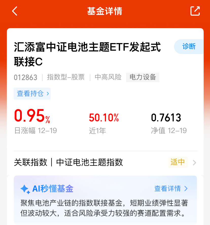 所以,今天趁着行情持续回暖,我打算右侧加仓$汇添富中证电池主题ETF发起式联接C(OTCFUND|012863)$啦,它紧密跟踪中证电池指数,聚焦储能概念、阳光电源等潜力方向,覆盖宁德、亿纬等潜力成长股,而且综合费率仅仅0.45%,基本上同类最低了,纵观其业绩,近三月涨幅3.82%,近半年涨幅61.19%,整体业绩弹性显著,随着日本加息落地,利空基本已逐步消化,从展望后市来看,对于明年的春季行情,市场资金有可能提前抢筹,所以今天趁势布局起来,看好后续行情走势啦!$广发国证新能源车电池ETF联接C(OTCFUND|013180)$0$招商中证电池主题ETF联接C(OTCFUND|016020)$#海南全岛封关 板块掀涨停潮!##现货黄金创历史新高!你上车了吗?#