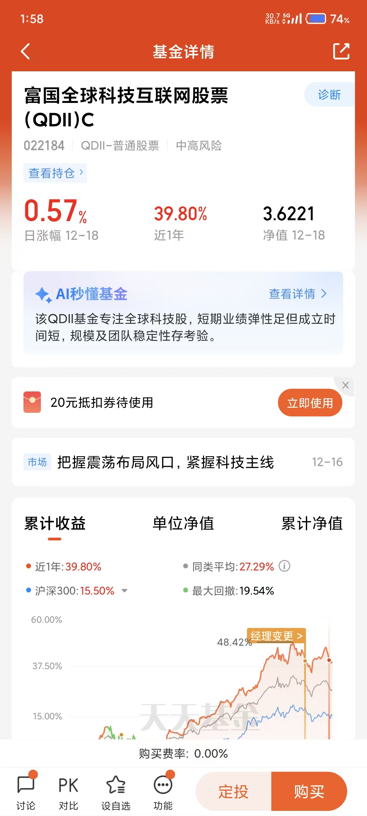 今天我选择加仓1000元富国全球科技互联网股票(QDII)人民币A(022184),主要投资于美国、中国(包括港股)、欧洲、日本等全球市场的科技公司,如美国的微软、苹果、英伟达,中国的腾讯、阿里巴巴等聚焦于科技创新、互联网、软件、半导体、云计算、人工智能等前沿领域。随着人工智能科技行业的不断发展,这只基金有望迎来一波行情。$富国全球科技互联网股票(QDII)C(OTCFUND|022184)$